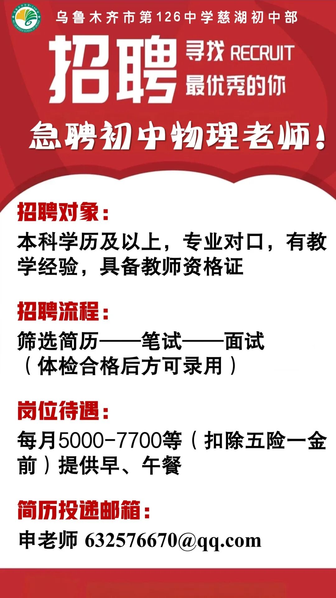 乌市第126中学慈湖初中部急聘初中物理老师